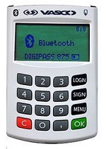 The Vasco Digipass 875 Vasco Data Logo signs documents wirelessly by connecting it to your smartphone or tablet using Bluetooth.